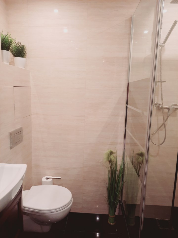 Mieszkanie jest w bardzo dobrym stanie technicznym – wysoki standard, środkowe i dwustronne. Wnętrze wykończone zostało dobrymi materiałami wysokiej jakości. W salonie, kuchni, dwóch sypialniach, przedpokoju i łazience z wc - podwieszane sufity z halogenami.