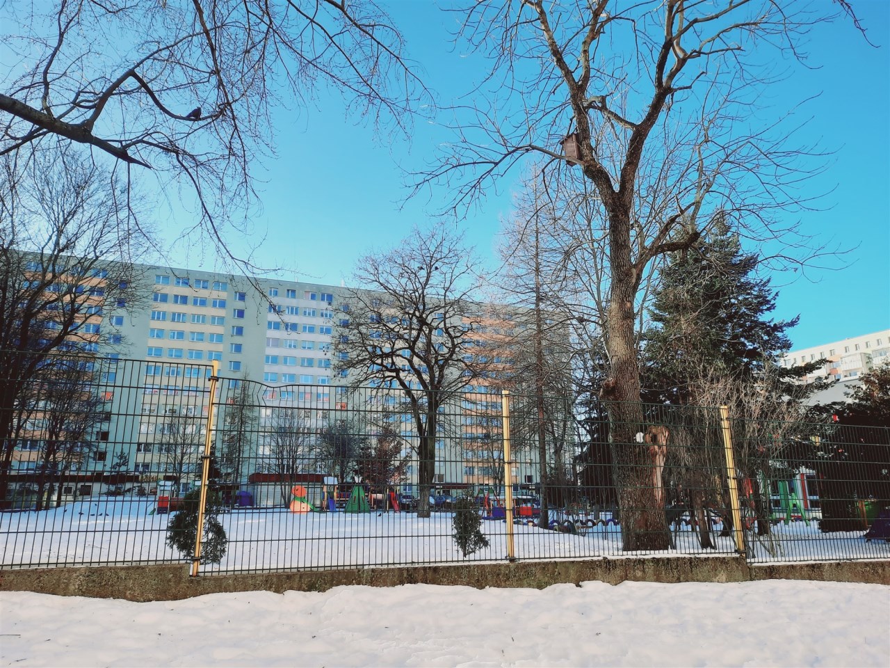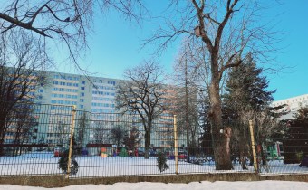 Przed budynkiem znajduje się dziedziniec z placem zabaw.