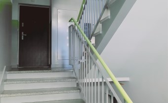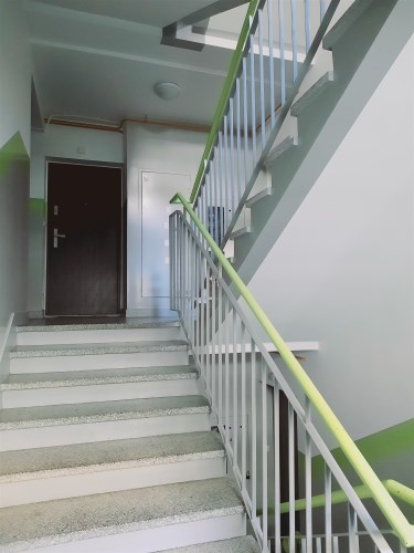 Przestronna, czysta i zadbana klatka schodowa.