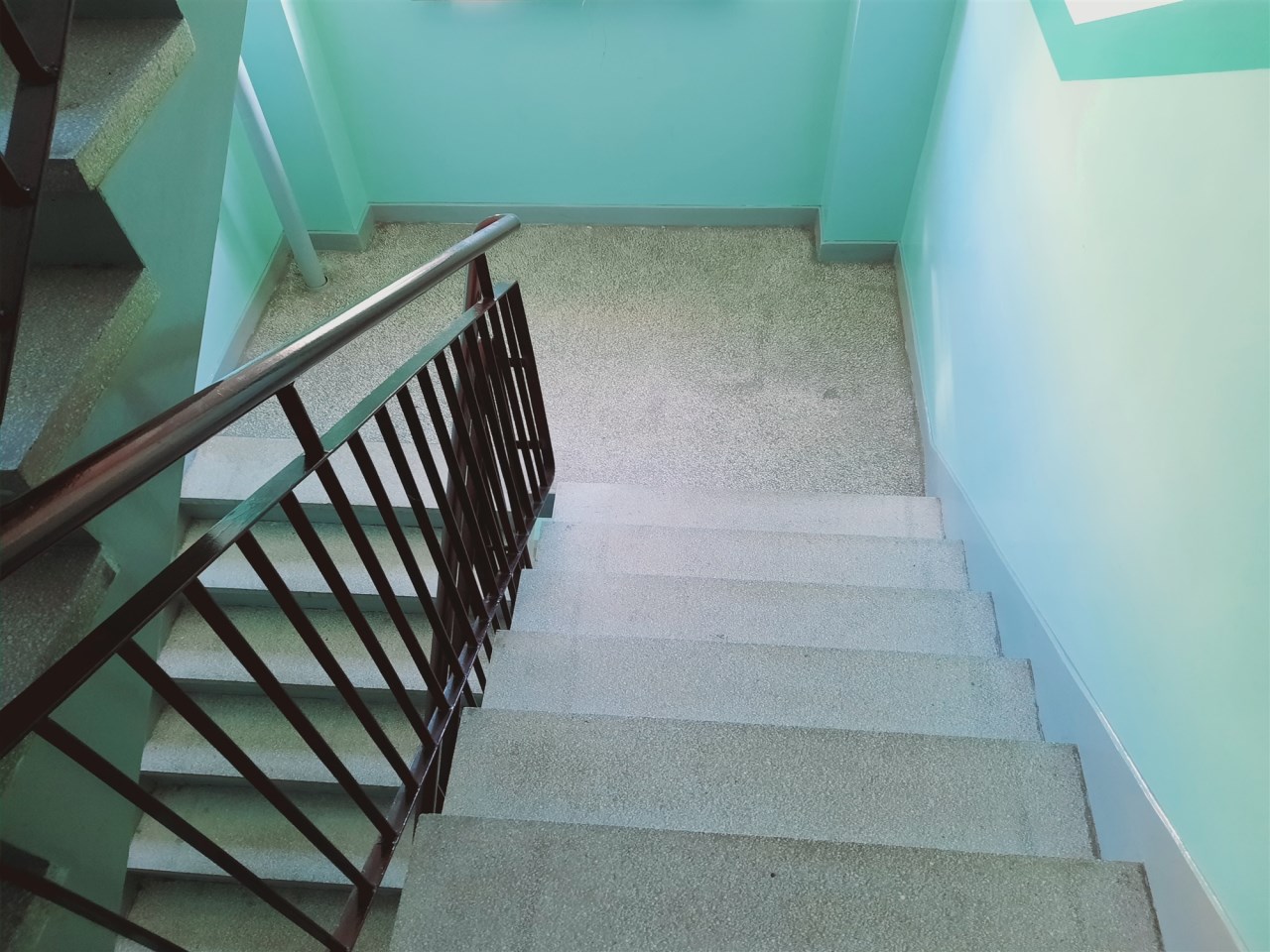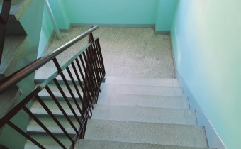 Przestronna, czysta i zadbana klatka schodowa.