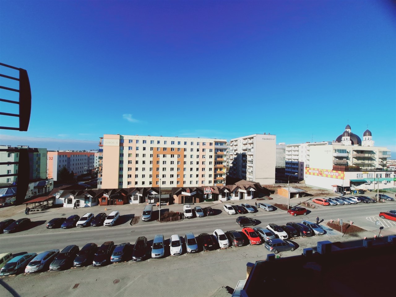 Przed budynkiem znajdują się duże parkingi.