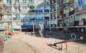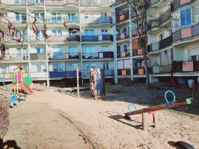 Przed budynkiem znajduje się dziedziniec z placem zabaw.