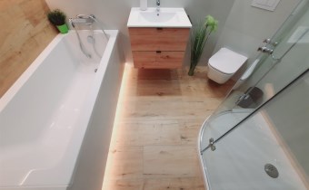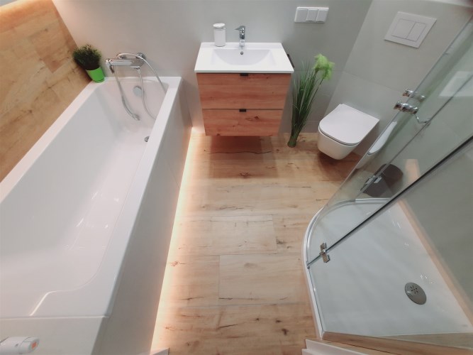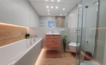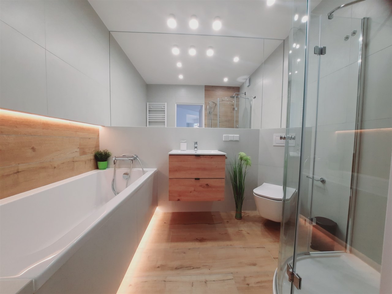 Apartament jest w bardzo dobrym stanie technicznym – wysoki standard, dwustronne. Wnętrze wykończone zostało drogimi materiałami wysokiej jakości. W łazience z wc - podwieszany sufit z halogenami.