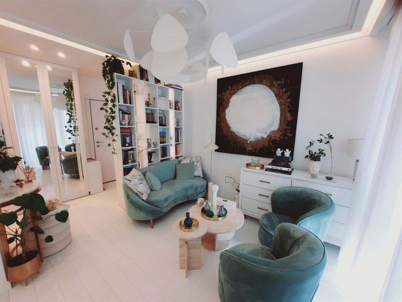 Salon, sypialnia, pokój i przedpokój – na podłodze biała deska.