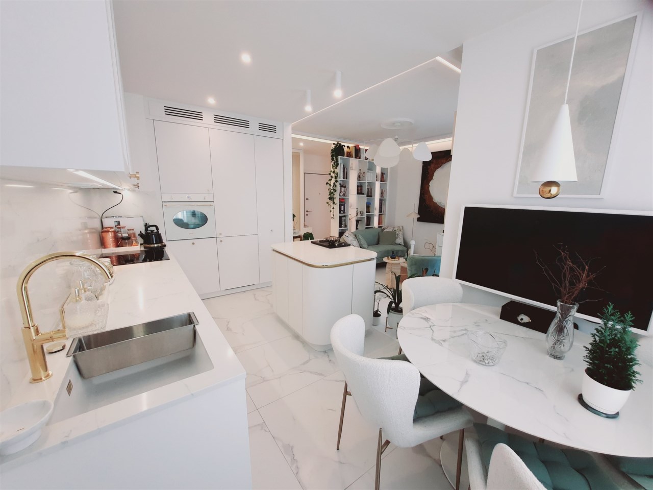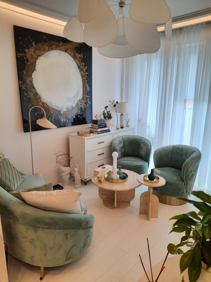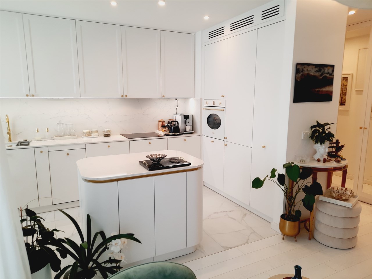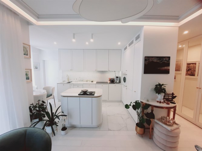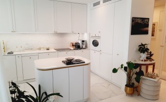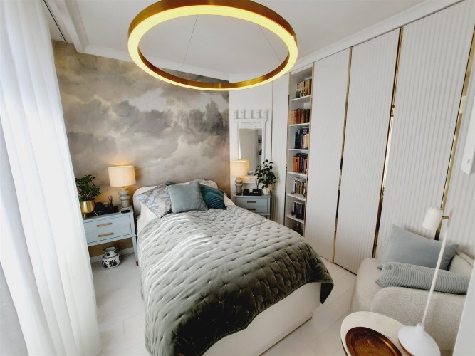 - zabudowa kuchenna z wyspą - zabudowy stałe w sypialni z garderobą - zabudowy stałe w pokoju - zabudowy stałe w przedpokoju - wyposażenie łazienki - sprzęt AGD wysokiej klasy: