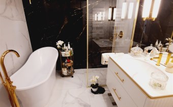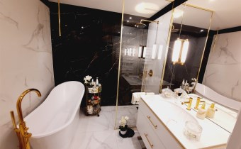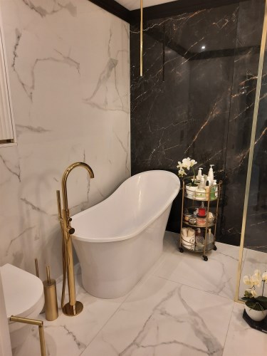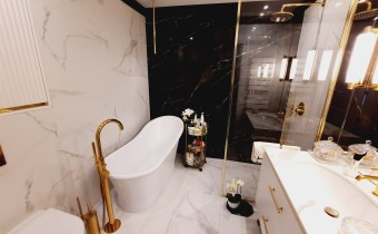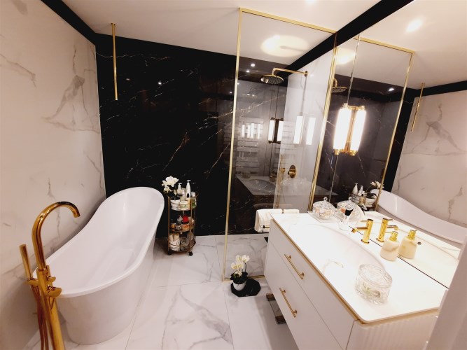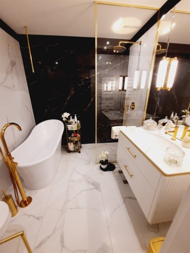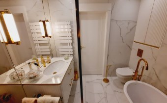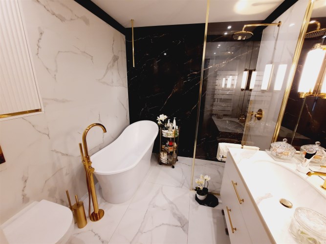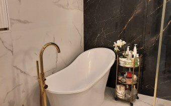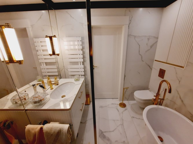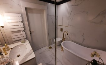 Łazienka z wc – kabina prysznicowa z deszczownicą, wanna, umywalka, sedes, armatura sanitarna wysokiej jakości, na podłodze gres.
