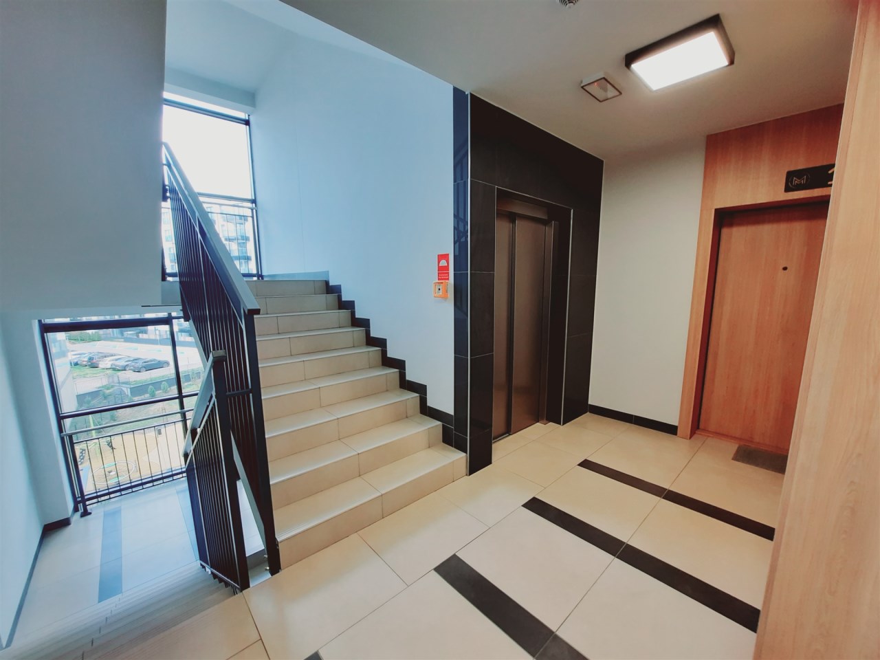 Przestronna, czysta i zadbana klatka schodowa.