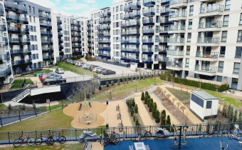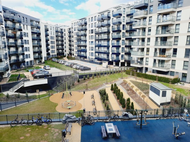 Przed budynkiem znajduje się dziedziniec z placem zabaw, siłownią oraz parkingiem przeznaczonym tylko dla mieszkańców.